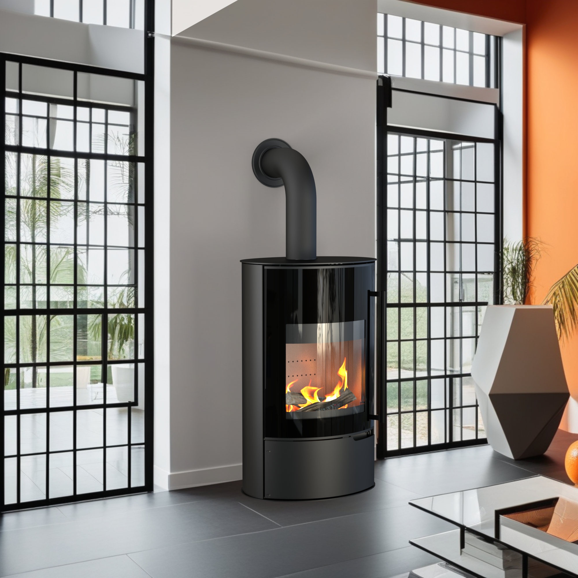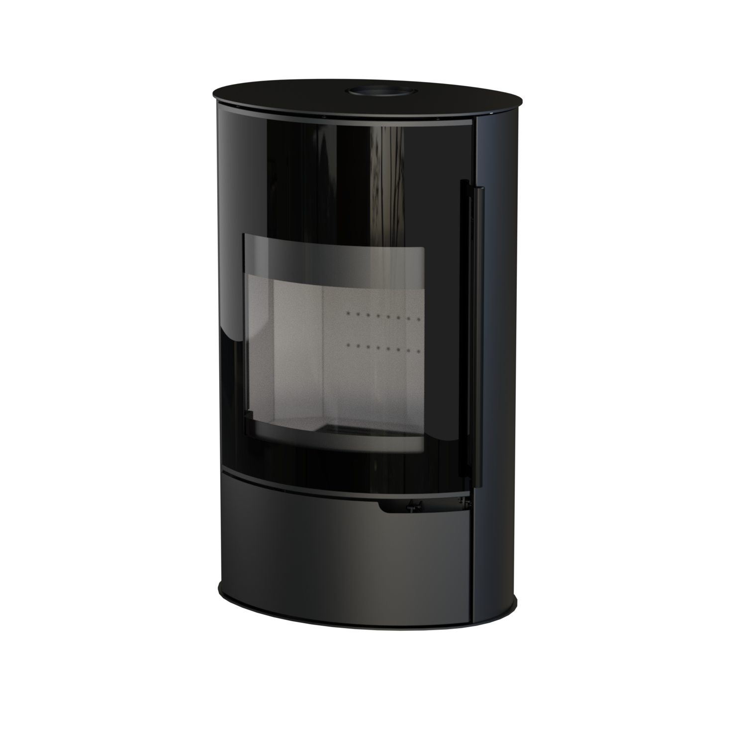 Okruglo tijelo od crnog čelika i velika, zaobljena panoramska vrata stvaraju snažan vizualni dojam. Pogled na plamen uvijek je čist zahvaljujući sustavu zračnog ispiranja stakla.